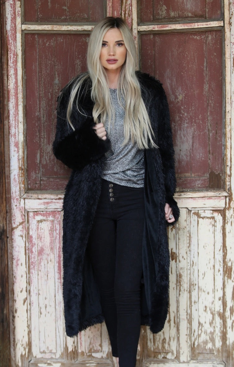 Soft, dramatic faux fur meets a sleek longline silhouette, creating the kind of piece that turns sidewalks into runways. Whether styled with denim + a graphic tee or layered over satin for an evening out, it elevates everything instantly.