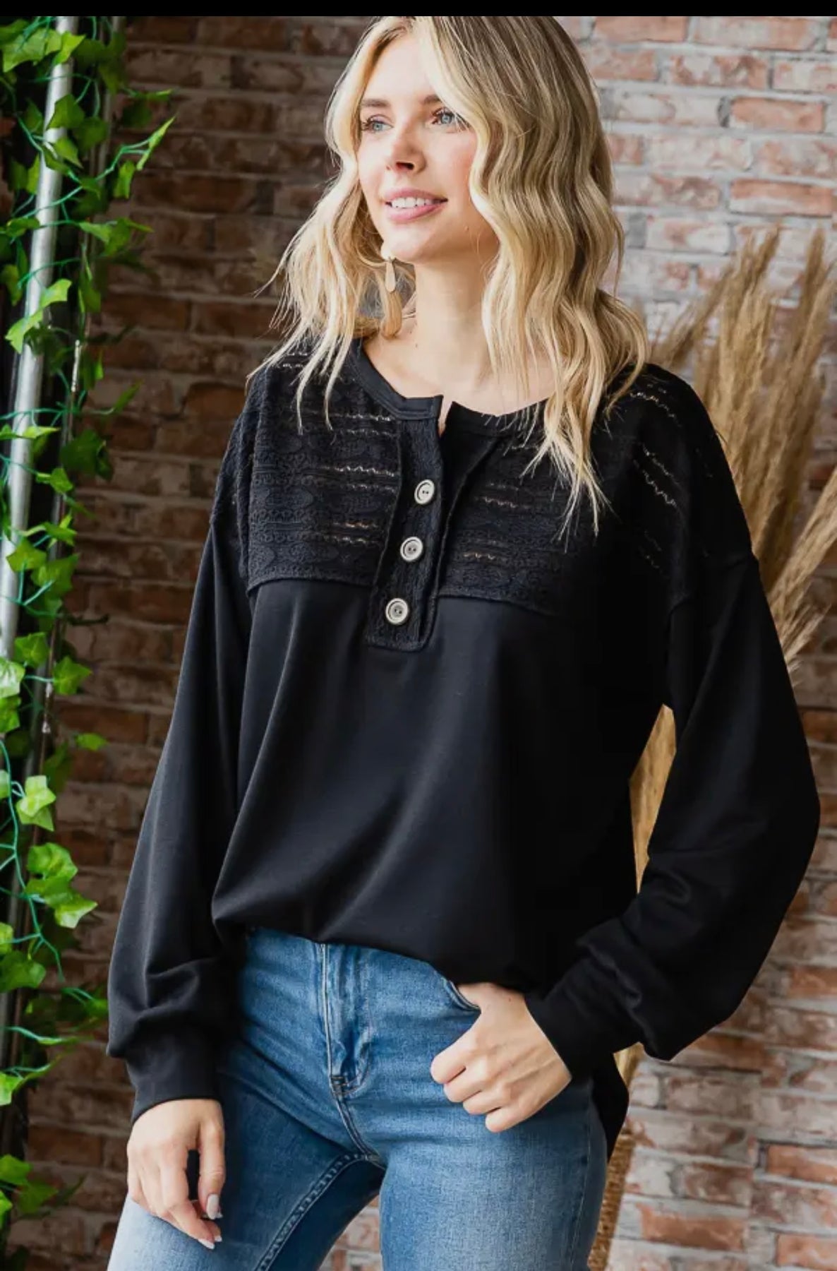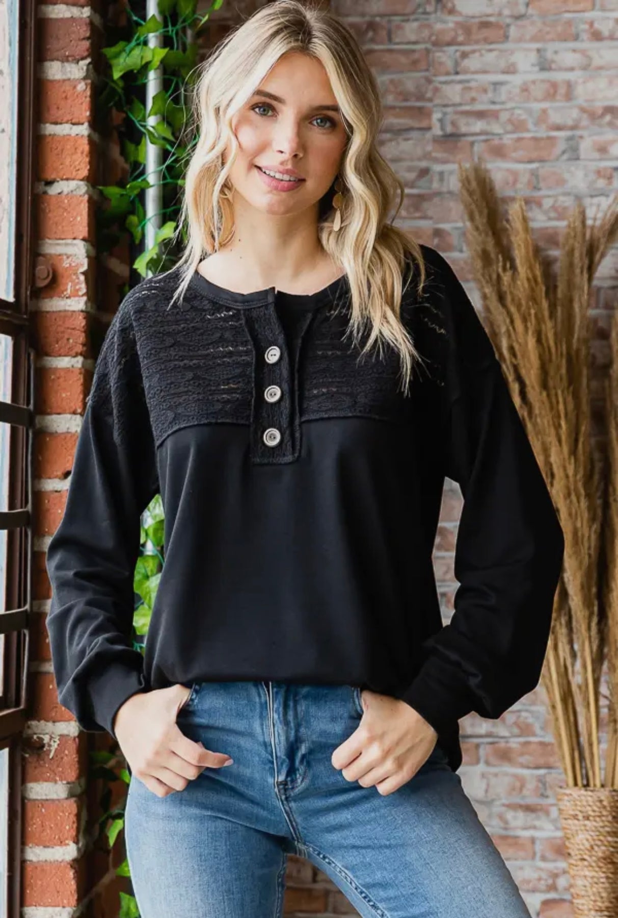 The Camden Lace Henley blends casual comfort with feminine charm. This soft, relaxed-fit top features delicate lace detailing across the yoke and a classic button-front neckline that adds a touch of sophistication to your everyday look. The subtle balloon sleeves and buttery fabric make it perfect for dressing up denim or layering under your favorite jacket.