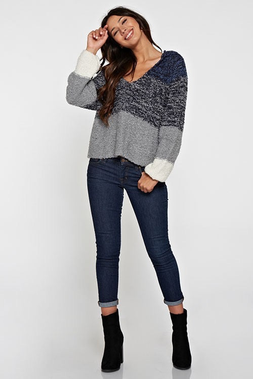 Cozy up this Fall with the Blue Horizon Sweater! Featuring a fun melange pullover style, playful color block knit, and a flattering v-neckline, it’s your new go-to for crisp days and cool nights. Long sleeves keep you warm while adding a stylish edge to any outfit. Perfect for layering or wearing solo—let this sweater bring a splash of charm to your autumn wardrobe!