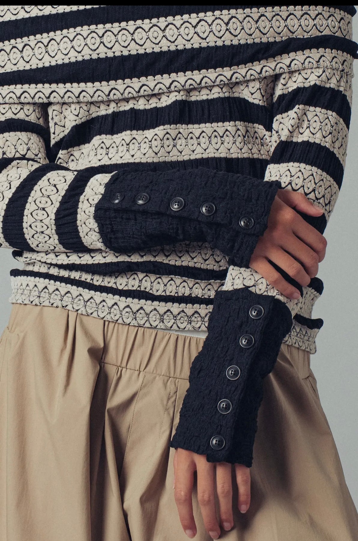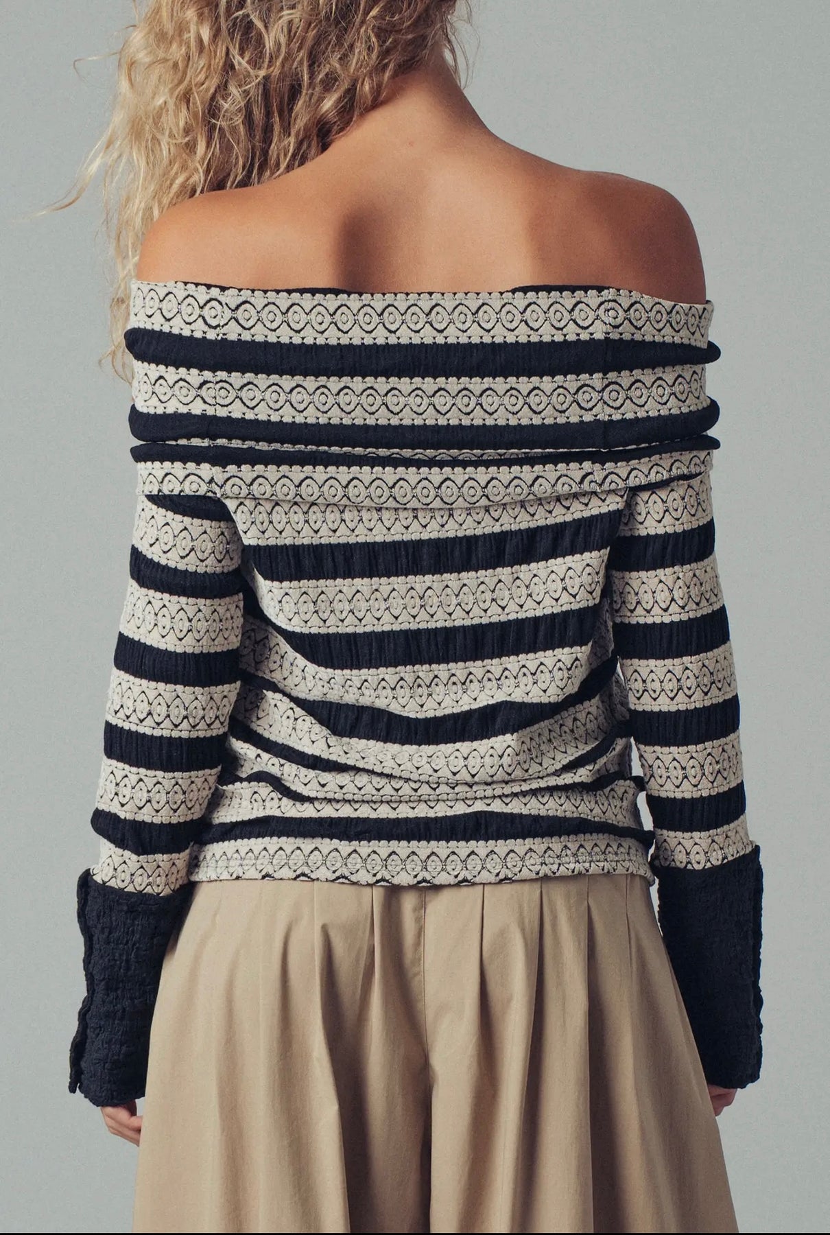 The Milan Off-Shoulder Sweater brings effortless sophistication with a modern twist. Featuring a chic off-the-shoulder neckline and textured knit design, this striped sweater adds instant polish to your fall wardrobe. The neutral black and taupe palette keeps it versatile, while the button-detailed cuffs give it that elevated boutique touch.