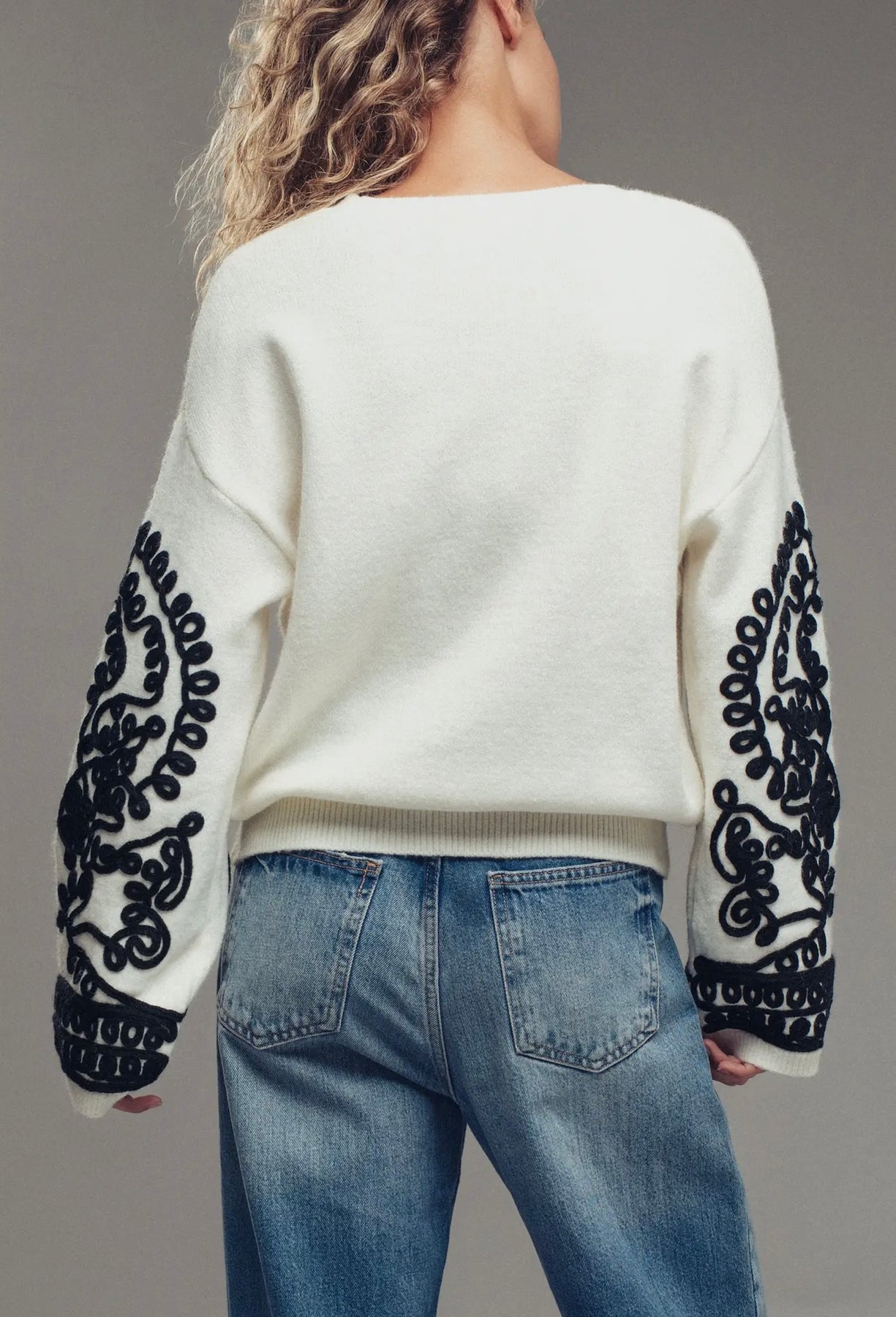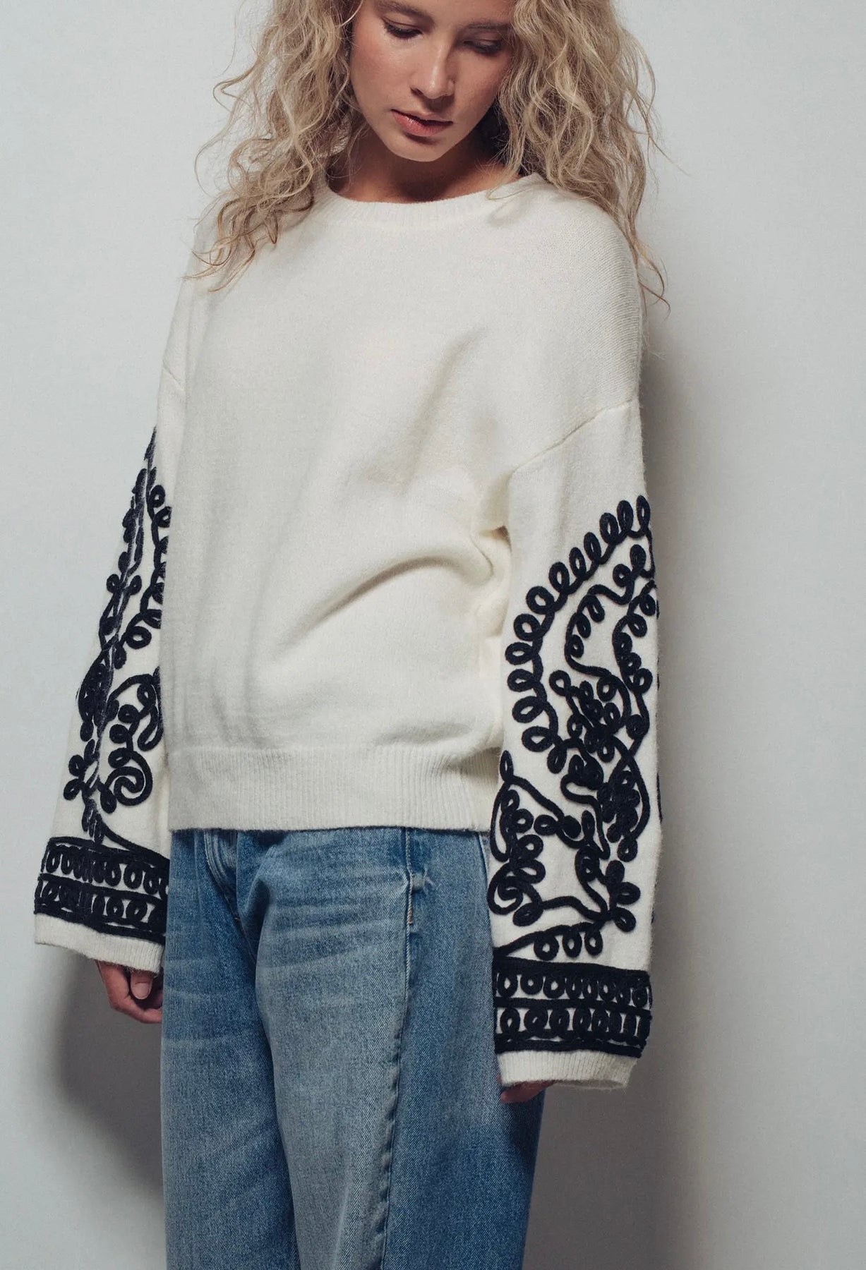 Where cozy meets couture π€ The Aspen Embroidered Sweater is a true standout piece with its bold, black embroidery detailing along the sleeves β effortlessly blending classic and chic. Made from a soft, mid-weight knit, itβs perfect for fall layering or those crisp winter days when you want warmth and style. Pair it with denim and boots for a relaxed mountain-town vibe or dress it up with black trousers and gold hoops for an elevated evening look.