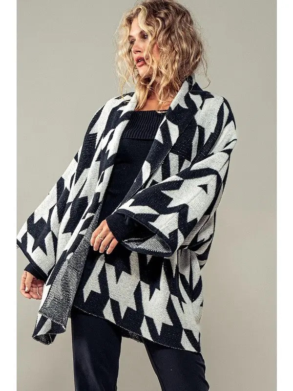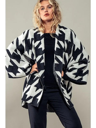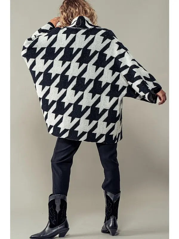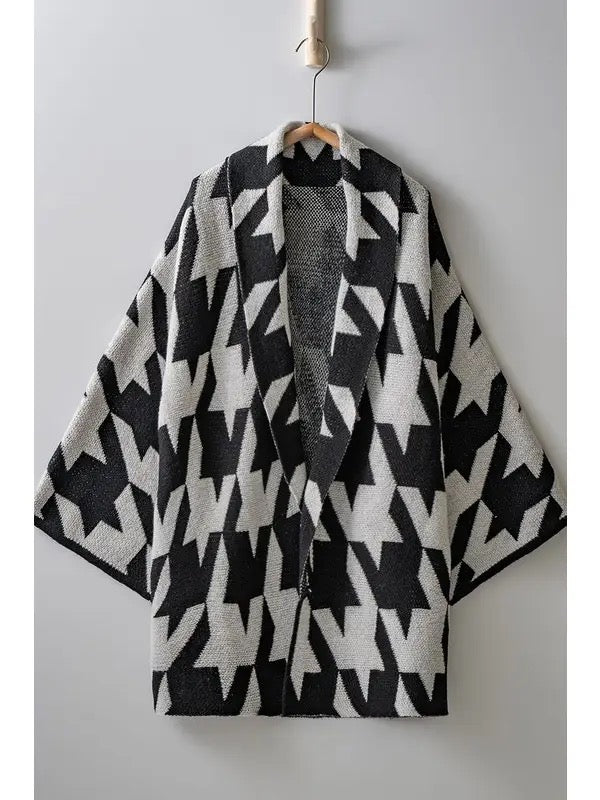 This oversized statement piece blends timeless pattern with modern comfort. The bold houndstooth knit gives it that classic-meets-edgy vibe, while the wide kimono-style sleeves and open-front design make it easy to throw on and go.