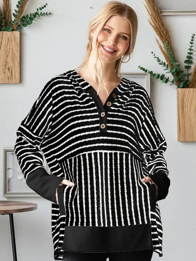 The contrasting stripe patterns create a slimming, elongated look, while the solid black trim and hem give it a polished finish. A henley neckline with three brushed-gold buttons adds just the right amount of detail. Bonus: front pockets for that cozy, hands-in-your-sleeves vibe we all love.