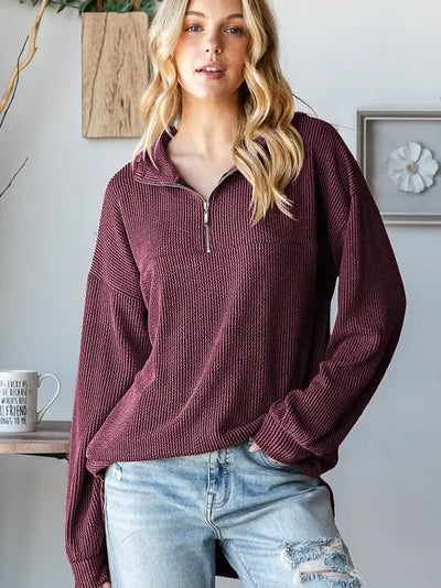 The relaxed fit, dropped shoulders, and subtle high-low hem give it that perfectly slouchy look we all love, while the half-zip neckline lets you switch between laid-back and slightly dressed-up in a snap. Zip it up for warmth, unzip it to show a layered tank or a little collarbone moment.