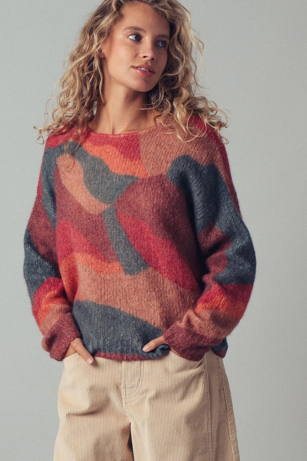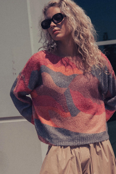 A soft, fuzzy dream with an abstract desert-inspired palette of rust, rose, and slate. The cropped, boxy fit and dropped shoulders make it effortlessly cool, while the blend of wool, nylon, and acrylic keeps it warm without the bulk.