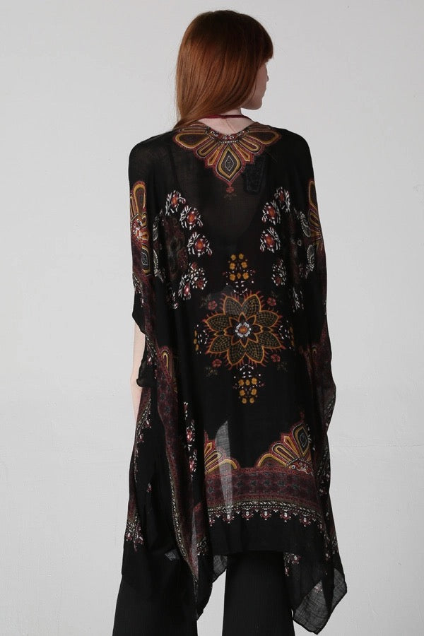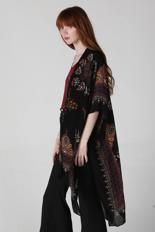 Bold florals + mosaic-inspired detailing fall across a deep black backdrop, giving you that wandered-markets-in-Moroccovibe without leaving home. Slip it over denim and a tank for easy daytime charm, or pair with wide-leg pants + jewelry for an elevated, artsy evening look.